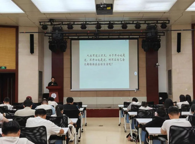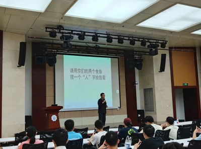 首先,陆雪松老师让大家用食指摆个人字,从一个小行为让大家多角度的去看待问题。接着,他讲述了两个心理学小故事并与同学们进行互动,让大家做了一个简单的心理测试,告诉大家要擦亮眼睛,正确认识当下形势。