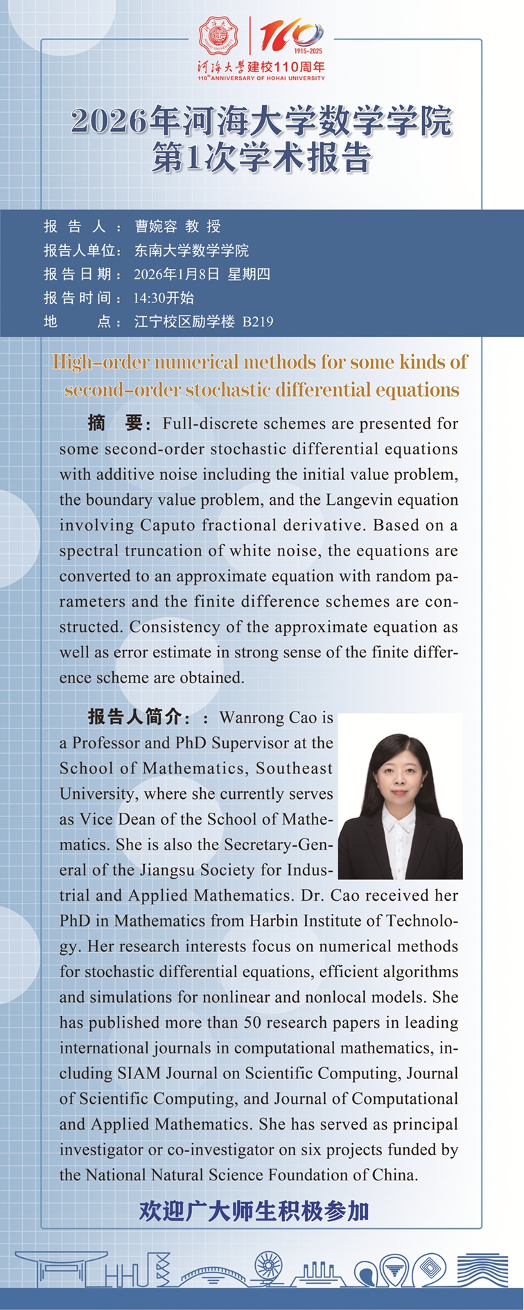 BETWAY必威2026年第1次学术报告:High-order numerical methods for some kinds of second-order stochastic differential equations