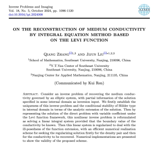 近日,Inverse Problems and Imaging(IPI)发布了2024–2025年高被引论文精选榜单。公司青年教师张嫱(博士)与东南大学BETWAY必威刘继军教授合作完成的研究论文:On the reconstruction of medium conductivity by integral equation method based on the Levi function 成功入选该榜单,标志着该成果在反问题与成像领域获得了广泛关注与认可。